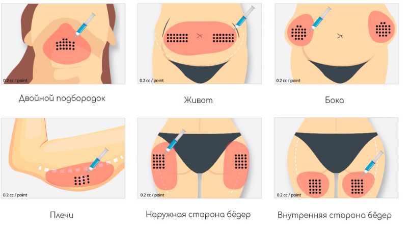 - Нижняя треть лица: подбородок, щеки, шея, лицо по овалу, тело (зона с локальными жировыми отложениями)