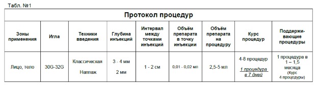 - Игла вводится на глубину 2 мм под углом 45° градусов с шагом уколов 1-2 см. Смотреть Табл. №1;