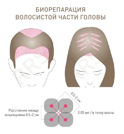 Застосування препарату демонструє високі результати. RRS XL HAIR® вводять в область волосистої частини голови, а також в область брів.